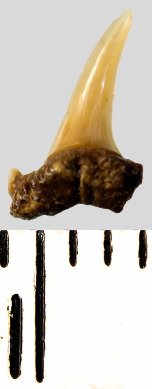 Мелкий боковой зуб с коронкой рыжевато-бежевого цвета, колюще-режущего типа, S-образно изогнутой, с гладким режущим краем. С лингвальной стороны у основания коронки на эмали имеется скульптура в виде слабой продольной струйчатости. Корень охристый, арочный, умеренно массивный, со следами окатанности, правая ветвь утрачена. Имеется одна питательная борозда с лингвальной стороны корня. Имелась одна пара добавочных зубцов коронки, сохранился только левый.