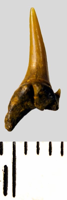 Мелкий боковой зуб с коронкой рыжевато-бежевого цвета, колюще-режущего типа, S-образно изогнутой, с гладким режущим краем. С лингвальной стороны у основания коронки на эмали имеется скульптура в виде слабой продольной струйчатости. Корень охристый, арочный, умеренно массивный, со следами окатанности, правая ветвь утрачена. Имеется одна питательная борозда с лингвальной стороны корня. Имелась одна пара добавочных зубцов коронки, сохранился только левый.