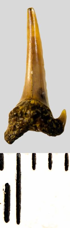 Мелкий боковой зуб с коронкой рыжевато-бежевого цвета, колюще-режущего типа, S-образно изогнутой, с гладким режущим краем. С лингвальной стороны у основания коронки на эмали имеется скульптура в виде слабой продольной струйчатости. Корень охристый, арочный, умеренно массивный, со следами окатанности, правая ветвь утрачена. Имеется одна питательная борозда с лингвальной стороны корня. Имелась одна пара добавочных зубцов коронки, сохранился только левый.