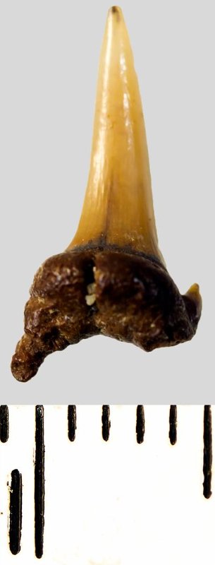 Мелкий боковой зуб с коронкой рыжевато-бежевого цвета, колюще-режущего типа, S-образно изогнутой, с гладким режущим краем. С лингвальной стороны у основания коронки на эмали имеется скульптура в виде слабой продольной струйчатости. Корень охристый, арочный, умеренно массивный, со следами окатанности, правая ветвь утрачена. Имеется одна питательная борозда с лингвальной стороны корня. Имелась одна пара добавочных зубцов коронки, сохранился только левый.