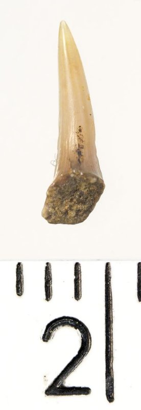 Зуб (фрагмент). Акула. Eostriatolamia subulata (Agassiz, 1843). Классификация: Хордовые Chordata, Позвоночные Vertebrata, Хрящевые рыбы Chondrichthyes, Пластиножаберные Elasmobranchii, Акулы Selachii, Ламнообразные Lamniformes, Песчаные акулы Odontaspididae