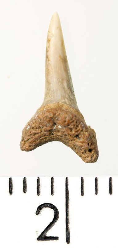 Зуб. Акула. Eostriatolamia subulata (Agassiz, 1843). Классификация: Хордовые Chordata, Позвоночные Vertebrata, Хрящевые рыбы Chondrichthyes, Пластиножаберные Elasmobranchii, Акулы Selachii, Ламнообразные Lamniformes, Песчаные акулы Odontaspididae