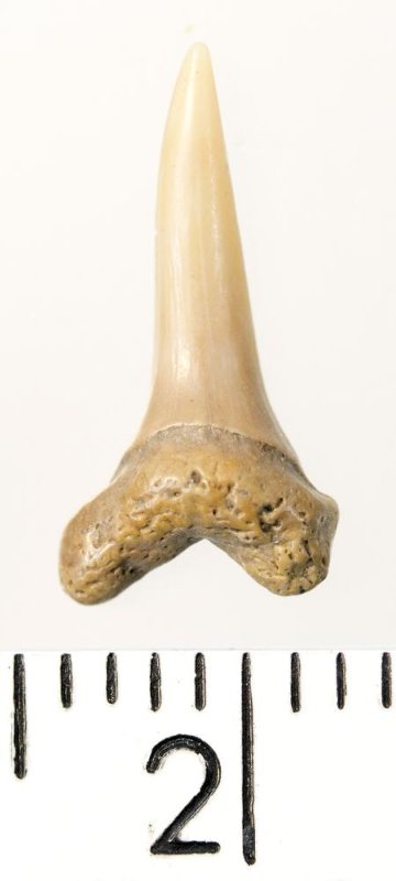 Мелкий боковой зуб с коронкой кремового цвета, режущего типа, S-образно изогнутой, без скульптуры, с гладким режущим краем. Корень охристый, арочный, умеренно массивный, со следами окатанности. Добавочные зубцы коронки отсутствуют.