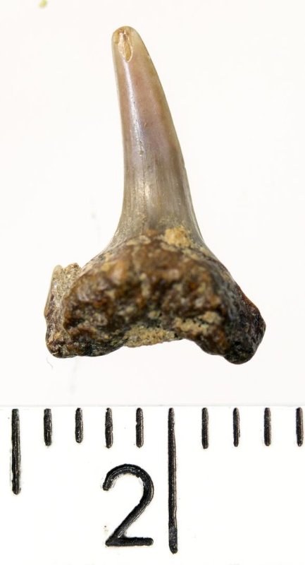 Мелкий боковой зуб с коронкой темно-бежевого цвета, колюще-режущего типа, S-образно изогнутой, без скульптуры, с гладким режущим краем. Корень бурый, арочный, умеренно массивный, со следами окатанности. Из одной пары добавочных зубцов коронки сохранился только левый.