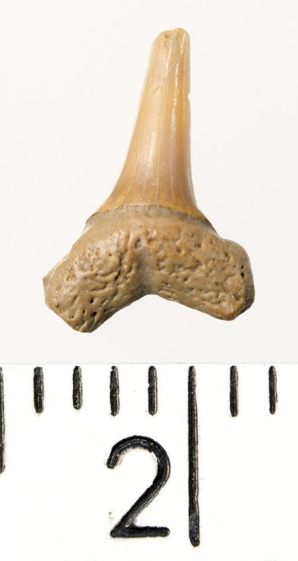 Мелкий боковой зуб с коронкой светло-охристого цвета, колюще-режущего типа, S-образно изогнутой, без скульптуры, с гладким режущим краем. Корень охристый, арочный, умеренно массивный, со следами окатанности. Имеется одна питательная борозда с лингвальной стороны корня. Добавочные зубцы коронки отсутствуют.