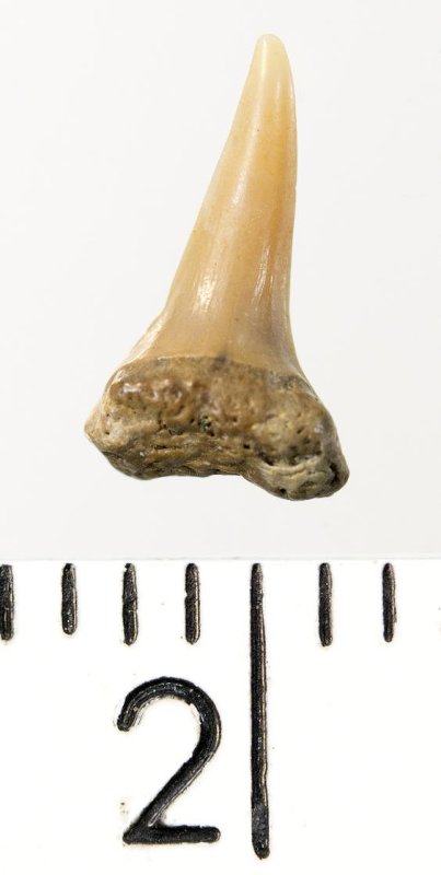 Мелкий боковой зуб с коронкой светло-охристого цвета, колюще-режущего типа, S-образно изогнутой, без скульптуры, с гладким режущим краем. Корень темно-охристый, арочный, умеренно массивный, со следами окатанности. Добавочные зубцы коронки отсутствуют.