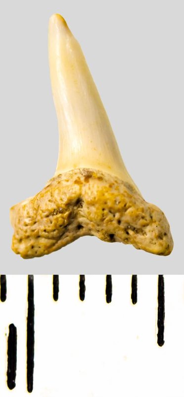 Мелкий боковой зуб с коронкой светло-кремового цвета, режущего типа, S-образно изогнутой, с гладким режущим краем. С лингвальной стороны у основания коронки на эмали имеется скульптура в виде слабой продольной струйчатости. Корень кремового цвета, арочный, умеренно массивный, со следами окатанности. Имеется одна питательная борозда с лингвальной стороны корня. Добавочные зубцы коронки зуба отсутствуют.
