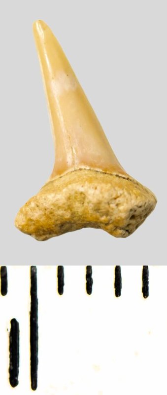 Мелкий боковой зуб с коронкой кремового цвета, режущего типа, S-образно изогнутой, с гладким режущим краем. Корень кремового цвета, арочный, умеренно массивный, со следами окатанности. Имеется одна питательная борозда с лингвальной стороны корня. Добавочные зубцы коронки зуба отсутствуют.