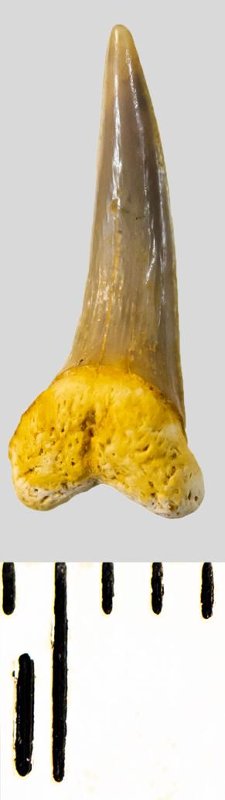Мелкий боковой зуб с коронкой серого цвета, колюще-режущего типа, S-образно изогнутой, с гладким режущим краем. С лингвальной стороны у основания коронки на эмали имеется скульптура в виде слабой продольной струйчатости. Корень светло-охристый, арочный, умеренно массивный, со следами окатанности. Имеется одна питательная борозда с лингвальной стороны корня. Добавочные зубцы коронки отсутствуют.