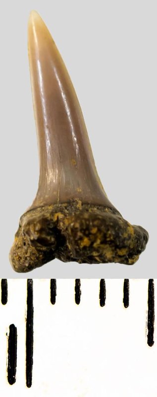 Мелкий боковой зуб с коронкой серого цвета, колюще-режущего типа, S-образно изогнутой, с гладким режущим краем. С лингвальной стороны у основания коронки на эмали имеется скульптура в виде слабой продольной струйчатости. Корень бурый, арочный, умеренно массивный, со следами окатанности. Имеется одна питательная борозда с лингвальной стороны корня. Добавочные зубцы коронки отсутствуют.