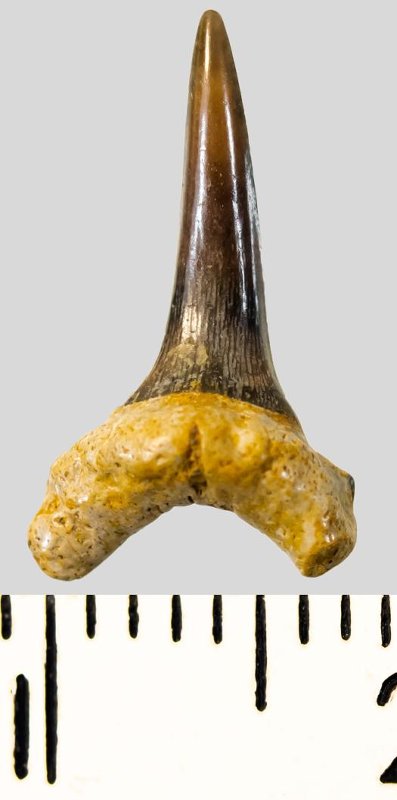Мелкий боковой зуб с коронкой бурого цвета, колюще-режущего типа, S-образно изогнутой, с гладким режущим краем. С лингвальной стороны у основания коронки на эмали имеются следы скульптуры в виде слабой продольной струйчатости. Корень охристо-кремового цвета, арочный, умеренно массивный, со следами окатанности. Имеется одна питательная борозда с лингвальной стороны корня. Добавочные зубцы коронки отсутствуют.