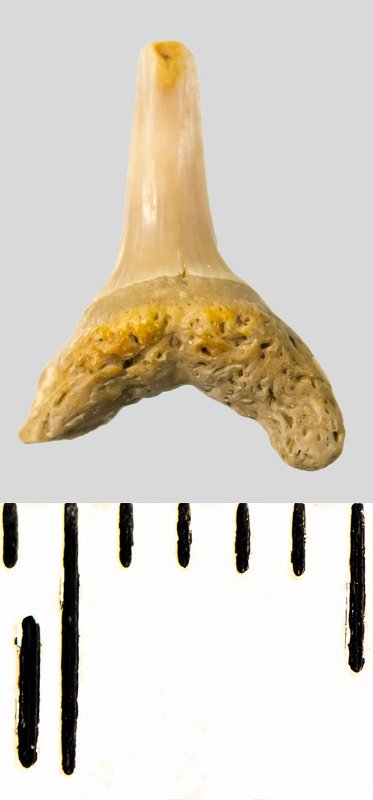 Мелкий боковой зуб с коронкой светло-кремового цвета, колюще-режущего типа, S-образно изогнутой, с гладким режущим краем. С лингвальной стороны у основания коронки на эмали имеется скульптура в виде слабой продольной струйчатости. Корень темно-кремового цвета, арочный, умеренно массивный, со следами окатанности. Имеется одна питательная борозда с лингвальной стороны корня. Добавочные зубцы коронки отсутствуют.