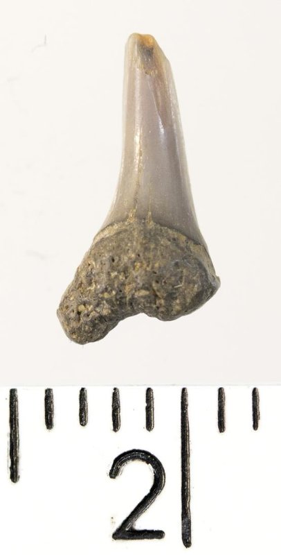 Мелкий боковой зуб с коронкой серого цвета, колюще-режущего типа, S-образно изогнутой, с гладким режущим краем. Корень бурый, арочный, умеренно массивный, со следами окатанности, правая ветвь утрачена. Добавочные зубцы коронки отсутствуют.