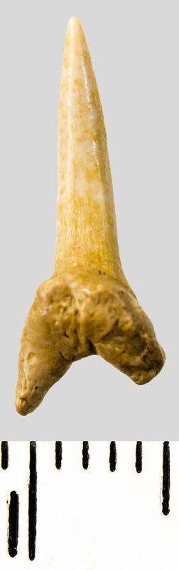 Мелкий передний зуб с коронкой кремового цвета, колюще-режущего типа, S-образно изогнутой, с гладким режущим краем. С лингвальной стороны у основания коронки на эмали имеется скульптура в виде слабой продольной струйчатости. Корень охристый, арочный, умеренно массивный, со следами окатанности. Имеется одна питательная борозда с лингвальной стороны корня. Добавочные зубцы коронки отсутствуют.