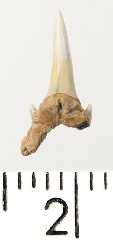 Зуб. Акула. Eostriatolamia subulata (Agassiz, 1843). Классификация: Хордовые Chordata, Позвоночные Vertebrata, Хрящевые рыбы Chondrichthyes, Пластиножаберные Elasmobranchii, Акулы Selachii, Ламнообразные Lamniformes, Песчаные акулы Odontaspididae