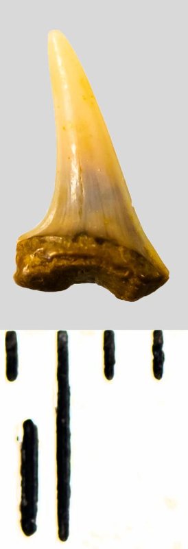 Мелкий боковой зуб с коронкой серо-кремового цвета, режущего типа, S-образно изогнутой, с гладким режущим краем. Корень темно-охристый, арочный, умеренно массивный, со следами окатанности. Добавочные зубцы коронки зуба отсутствуют.