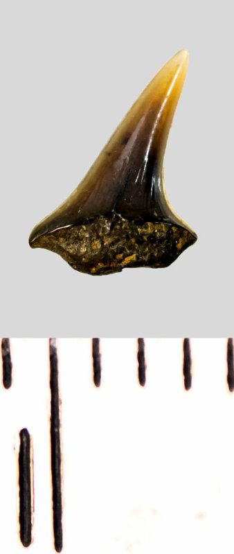 Зуб (фрагмент). Акула. Eostriatolamia subulata (Agassiz, 1843). Классификация: Хордовые Chordata, Позвоночные Vertebrata, Хрящевые рыбы Chondrichthyes, Пластиножаберные Elasmobranchii, Акулы Selachii, Ламнообразные Lamniformes, Песчаные акулы Odontaspididae