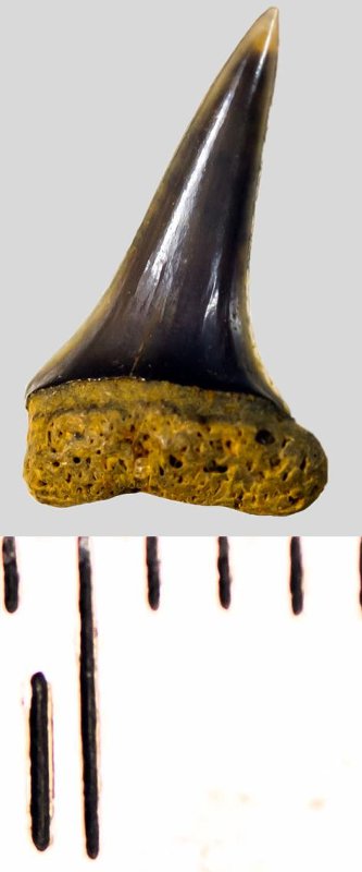 Зуб (фрагмент). Акула. Eostriatolamia subulata (Agassiz, 1843). Классификация: Хордовые Chordata, Позвоночные Vertebrata, Хрящевые рыбы Chondrichthyes, Пластиножаберные Elasmobranchii, Акулы Selachii, Ламнообразные Lamniformes, Песчаные акулы Odontaspididae