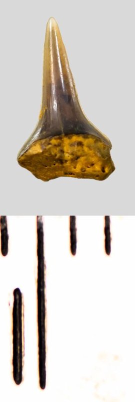 Зуб (фрагмент). Акула. Eostriatolamia subulata (Agassiz, 1843). Классификация: Хордовые Chordata, Позвоночные Vertebrata, Хрящевые рыбы Chondrichthyes, Пластиножаберные Elasmobranchii, Акулы Selachii, Ламнообразные Lamniformes, Песчаные акулы Odontaspididae