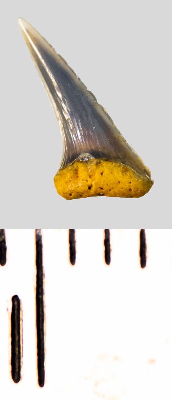 Зуб (фрагмент). Акула. Eostriatolamia subulata (Agassiz, 1843). Классификация: Хордовые Chordata, Позвоночные Vertebrata, Хрящевые рыбы Chondrichthyes, Пластиножаберные Elasmobranchii, Акулы Selachii, Ламнообразные Lamniformes, Песчаные акулы Odontaspididae