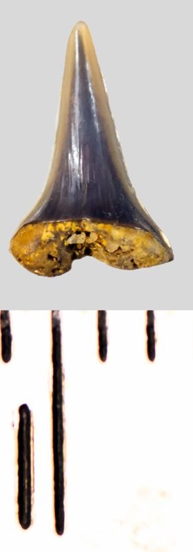 Зуб (фрагмент). Акула. Eostriatolamia subulata (Agassiz, 1843). Классификация: Хордовые Chordata, Позвоночные Vertebrata, Хрящевые рыбы Chondrichthyes, Пластиножаберные Elasmobranchii, Акулы Selachii, Ламнообразные Lamniformes, Песчаные акулы Odontaspididae