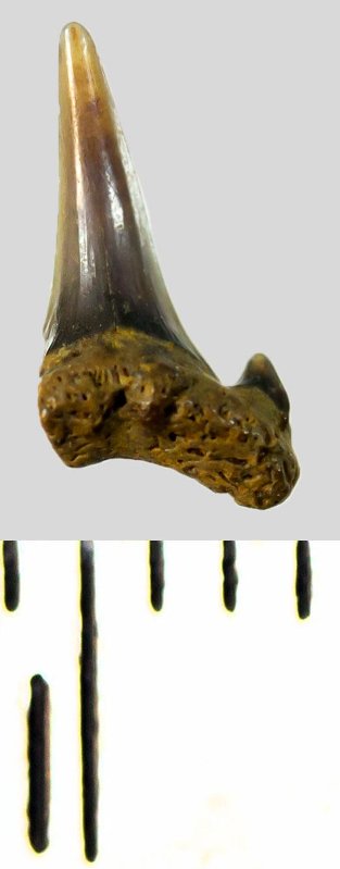 Зуб. Акула. Eostriatolamia subulata (Agassiz, 1843). Классификация: Хордовые Chordata, Позвоночные Vertebrata, Хрящевые рыбы Chondrichthyes, Пластиножаберные Elasmobranchii, Акулы Selachii, Ламнообразные Lamniformes, Песчаные акулы Odontaspididae