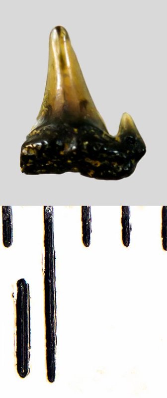 Мелкий боковой зуб с коронкой серого цвета, колюще-режущего типа, S-образно изогнутой, с гладким режущим краем. С лингвальной стороны у основания коронки на эмали имеется скульптура в виде слабой продольной струйчатости. Корень охристый, арочный, умеренно массивный, со следами окатанности; левая ветвь утрачена. Имеется одна питательная борозда с лингвальной стороны корня. Имелась одна пара добавочных зубцов коронки, сохранился только правый.