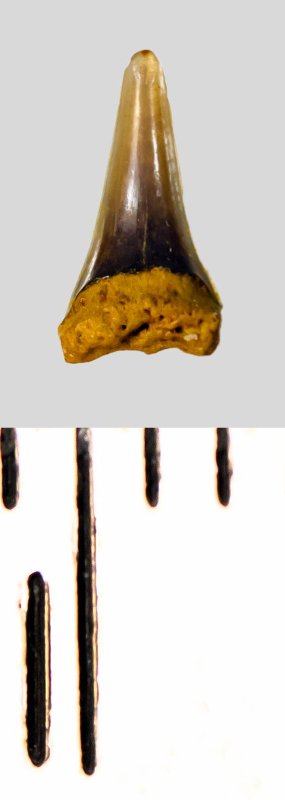Зуб (фрагмент). Акула. Eostriatolamia subulata (Agassiz, 1843). Классификация: Хордовые Chordata, Позвоночные Vertebrata, Хрящевые рыбы Chondrichthyes, Пластиножаберные Elasmobranchii, Акулы Selachii, Ламнообразные Lamniformes, Песчаные акулы Odontaspididae