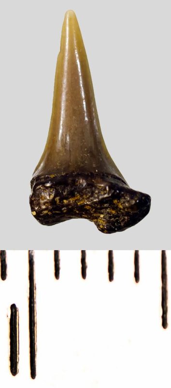 Зуб (фрагмент). Акула. Eostriatolamia subulata (Agassiz, 1843). Классификация: Хордовые Chordata, Позвоночные Vertebrata, Хрящевые рыбы Chondrichthyes, Пластиножаберные Elasmobranchii, Акулы Selachii, Ламнообразные Lamniformes, Песчаные акулы Odontaspididae
