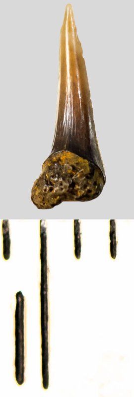Зуб (фрагмент). Акула. Eostriatolamia subulata (Agassiz, 1843). Классификация: Хордовые Chordata, Позвоночные Vertebrata, Хрящевые рыбы Chondrichthyes, Пластиножаберные Elasmobranchii, Акулы Selachii, Ламнообразные Lamniformes, Песчаные акулы Odontaspididae