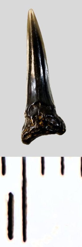 Зуб (фрагмент). Акула. Eostriatolamia subulata (Agassiz, 1843). Классификация: Хордовые Chordata, Позвоночные Vertebrata, Хрящевые рыбы Chondrichthyes, Пластиножаберные Elasmobranchii, Акулы Selachii, Ламнообразные Lamniformes, Песчаные акулы Odontaspididae
