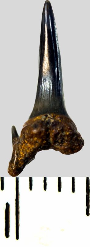 Мелкий боковой зуб с коронкой серого цвета, колюще-режущего типа, S-образно изогнутой, с гладким режущим краем. С лингвальной стороны у основания коронки на эмали имеется скульптура в виде слабой продольной струйчатости. Корень охристый, арочный, умеренно массивный, со следами окатанности; правая ветвь утрачена. Имеется одна питательная борозда с лингвальной стороны корня. Имелась одна пара добавочных зубцов коронки, сохранился только левый.
