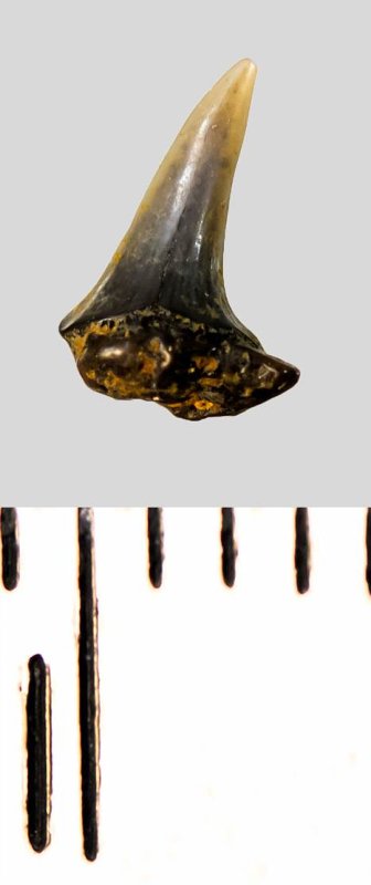 Коронка мелкого бокового зуба темно-серого цвета, колюще-режущего типа, S-образно изогнутая, с гладким режущим краем. С лингвальной стороны у основания коронки на эмали имеется скульптура в виде слабой продольной струйчатости. Корень охристый, сильно окатанный, сохранился фрагментарно
