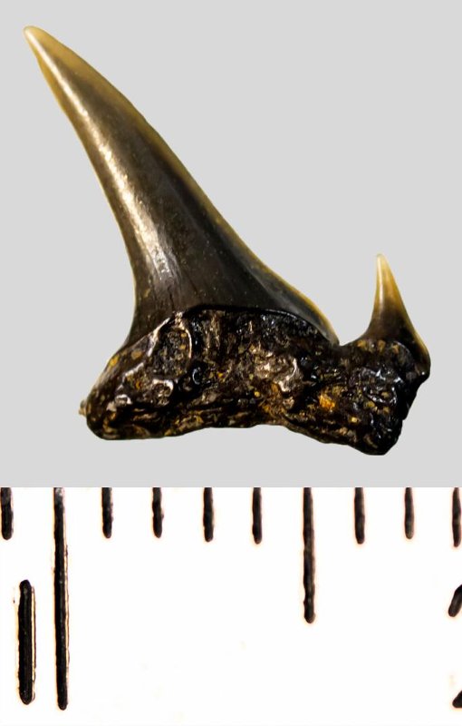 Зуб (фрагмент). Акула. Eostriatolamia subulata (Agassiz, 1843). Классификация: Хордовые Chordata, Позвоночные Vertebrata, Хрящевые рыбы Chondrichthyes, Пластиножаберные Elasmobranchii, Акулы Selachii, Ламнообразные Lamniformes, Песчаные акулы Odontaspididae