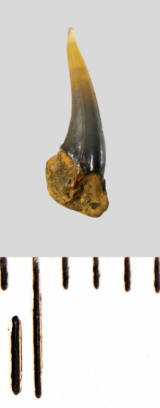 Коронка мелкого бокового зуба темно-серого цвета, колюще-режущего типа, S-образно изогнутая, с гладким режущим краем. С лингвальной стороны у основания коронки на эмали имеется скульптура в виде слабой продольной струйчатости. Корень охристый, сильно окатанный, сохранился фрагментарно