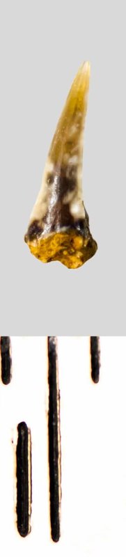 Зуб (фрагмент). Акула. Eostriatolamia subulata (Agassiz, 1843). Классификация: Хордовые Chordata, Позвоночные Vertebrata, Хрящевые рыбы Chondrichthyes, Пластиножаберные Elasmobranchii, Акулы Selachii, Ламнообразные Lamniformes, Песчаные акулы Odontaspididae