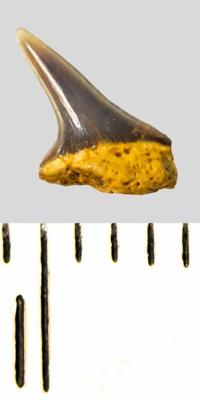 Зуб (фрагмент). Акула. Eostriatolamia subulata (Agassiz, 1843). Классификация: Хордовые Chordata, Позвоночные Vertebrata, Хрящевые рыбы Chondrichthyes, Пластиножаберные Elasmobranchii, Акулы Selachii, Ламнообразные Lamniformes, Песчаные акулы Odontaspididae