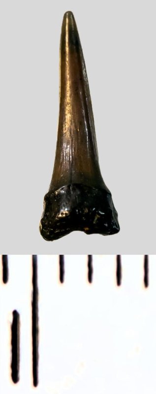 Зуб (фрагмент). Акула. Eostriatolamia subulata (Agassiz, 1843). Классификация: Хордовые Chordata, Позвоночные Vertebrata, Хрящевые рыбы Chondrichthyes, Пластиножаберные Elasmobranchii, Акулы Selachii, Ламнообразные Lamniformes, Песчаные акулы Odontaspididae