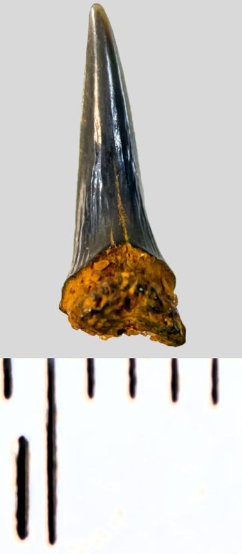 Зуб (фрагмент). Акула. Eostriatolamia subulata (Agassiz, 1843). Классификация: Хордовые Chordata, Позвоночные Vertebrata, Хрящевые рыбы Chondrichthyes, Пластиножаберные Elasmobranchii, Акулы Selachii, Ламнообразные Lamniformes, Песчаные акулы Odontaspididae