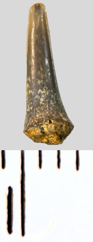Зуб (фрагмент). Акула. Eostriatolamia subulata (Agassiz, 1843). Классификация: Хордовые Chordata, Позвоночные Vertebrata, Хрящевые рыбы Chondrichthyes, Пластиножаберные Elasmobranchii, Акулы Selachii, Ламнообразные Lamniformes, Песчаные акулы Odontaspididae
