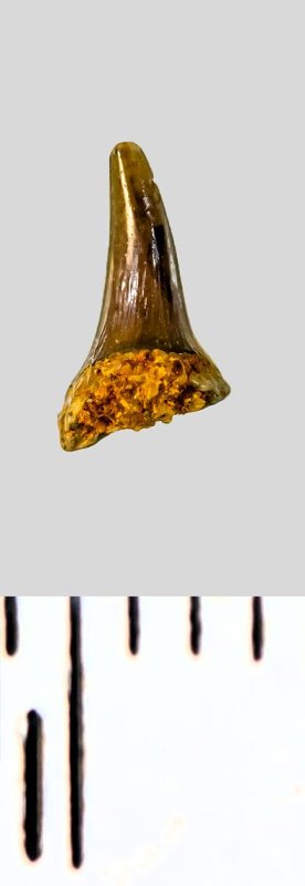 Коронка мелкого бокового зуба темно-серого цвета, колюще-режущего типа, S-образно изогнутая, с гладким режущим краем. С лингвальной стороны у основания коронки на эмали имеется скульптура в виде слабой продольной струйчатости. Корень охристый, сильно окатанный, сохранился фрагментарно