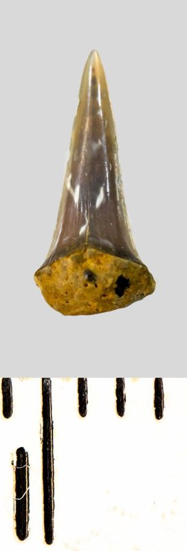 Зуб (фрагмент). Акула. Eostriatolamia subulata (Agassiz, 1843). Классификация: Хордовые Chordata, Позвоночные Vertebrata, Хрящевые рыбы Chondrichthyes, Пластиножаберные Elasmobranchii, Акулы Selachii, Ламнообразные Lamniformes, Песчаные акулы Odontaspididae