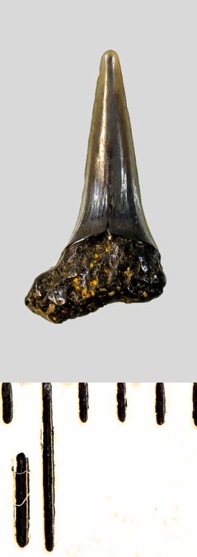 Зуб (фрагмент). Акула. Eostriatolamia subulata (Agassiz, 1843). Классификация: Хордовые Chordata, Позвоночные Vertebrata, Хрящевые рыбы Chondrichthyes, Пластиножаберные Elasmobranchii, Акулы Selachii, Ламнообразные Lamniformes, Песчаные акулы Odontaspididae