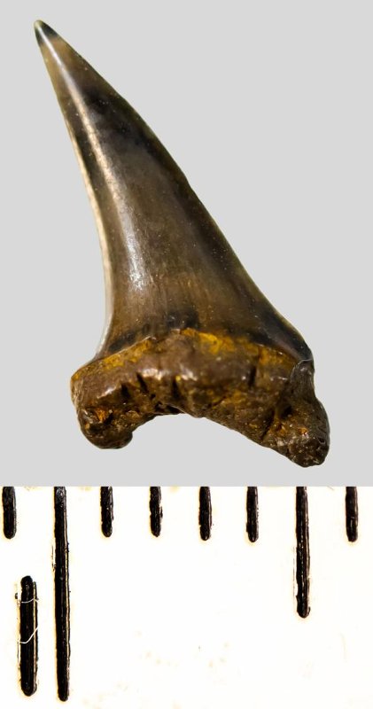 Зуб (фрагмент). Акула. Eostriatolamia subulata (Agassiz, 1843). Классификация: Хордовые Chordata, Позвоночные Vertebrata, Хрящевые рыбы Chondrichthyes, Пластиножаберные Elasmobranchii, Акулы Selachii, Ламнообразные Lamniformes, Песчаные акулы Odontaspididae