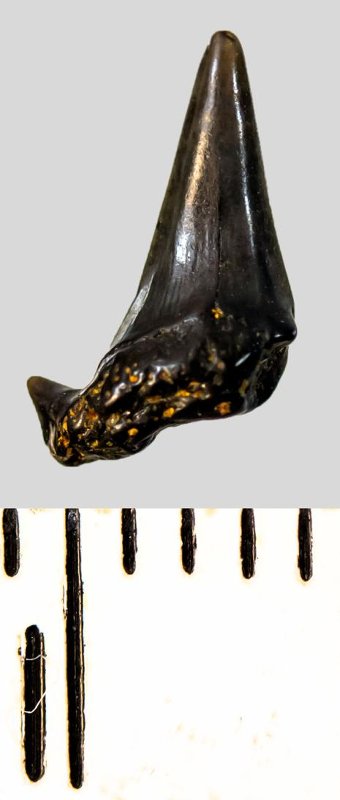 Зуб (фрагмент). Акула. Eostriatolamia subulata (Agassiz, 1843). Классификация: Хордовые Chordata, Позвоночные Vertebrata, Хрящевые рыбы Chondrichthyes, Пластиножаберные Elasmobranchii, Акулы Selachii, Ламнообразные Lamniformes, Песчаные акулы Odontaspididae