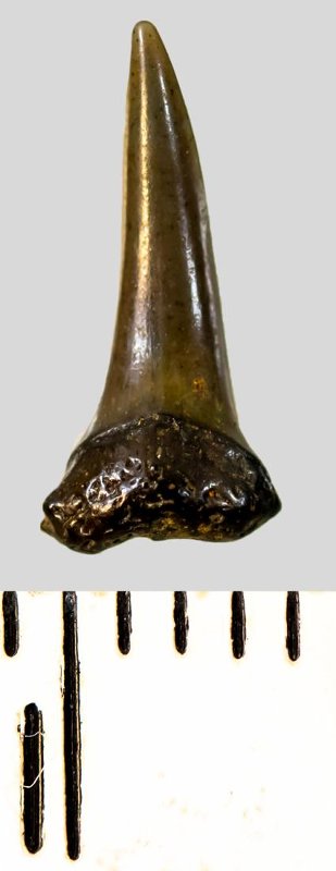 Коронка мелкого бокового зуба темно-серого цвета, колюще-режущего типа, S-образно изогнутая, с гладким режущим краем. С лингвальной стороны у основания коронки на эмали имеется скульптура в виде слабой продольной струйчатости. Корень охристый, сильно окатанный, сохранился фрагментарно