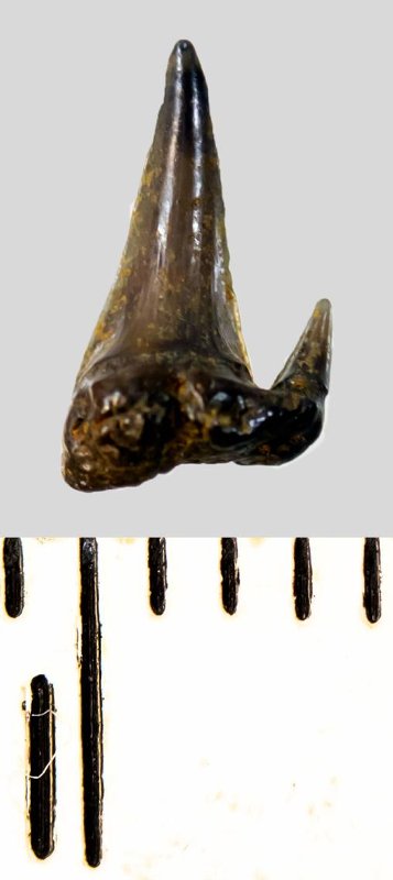 Зуб (фрагмент). Акула. Eostriatolamia subulata (Agassiz, 1843). Классификация: Хордовые Chordata, Позвоночные Vertebrata, Хрящевые рыбы Chondrichthyes, Пластиножаберные Elasmobranchii, Акулы Selachii, Ламнообразные Lamniformes, Песчаные акулы Odontaspididae