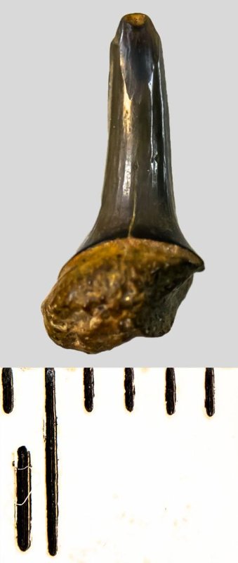 Зуб (фрагмент). Акула. Eostriatolamia subulata (Agassiz, 1843). Классификация: Хордовые Chordata, Позвоночные Vertebrata, Хрящевые рыбы Chondrichthyes, Пластиножаберные Elasmobranchii, Акулы Selachii, Ламнообразные Lamniformes, Песчаные акулы Odontaspididae