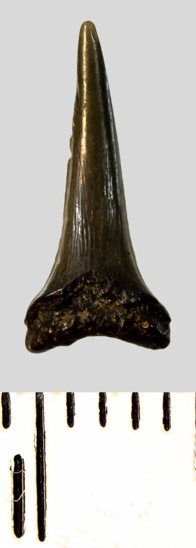Зуб (фрагмент). Акула. Eostriatolamia subulata (Agassiz, 1843). Классификация: Хордовые Chordata, Позвоночные Vertebrata, Хрящевые рыбы Chondrichthyes, Пластиножаберные Elasmobranchii, Акулы Selachii, Ламнообразные Lamniformes, Песчаные акулы Odontaspididae