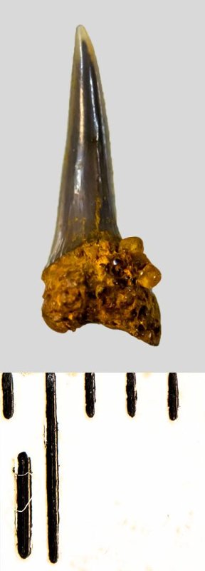 Зуб (фрагмент). Акула. Eostriatolamia subulata (Agassiz, 1843). Классификация: Хордовые Chordata, Позвоночные Vertebrata, Хрящевые рыбы Chondrichthyes, Пластиножаберные Elasmobranchii, Акулы Selachii, Ламнообразные Lamniformes, Песчаные акулы Odontaspididae